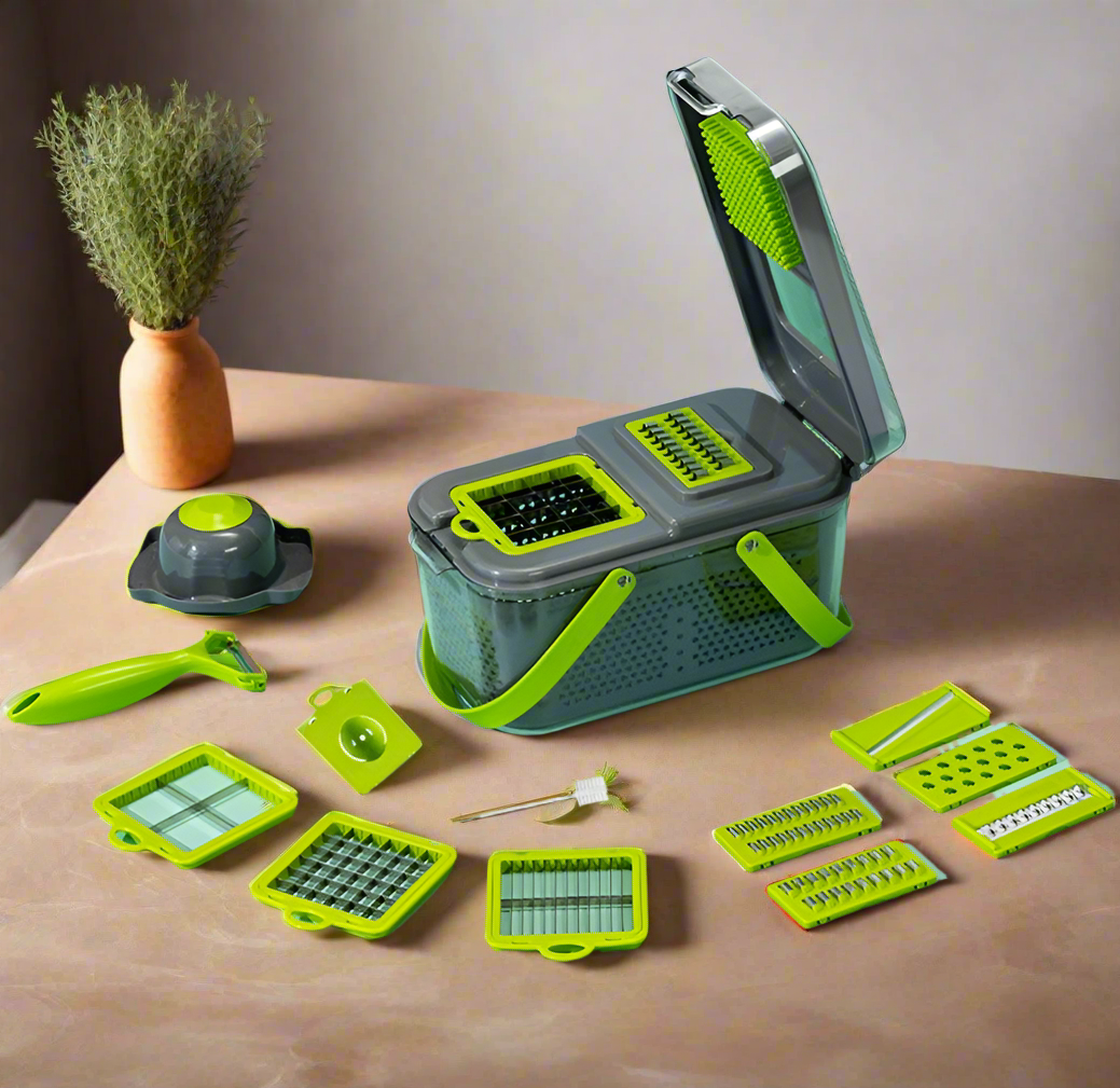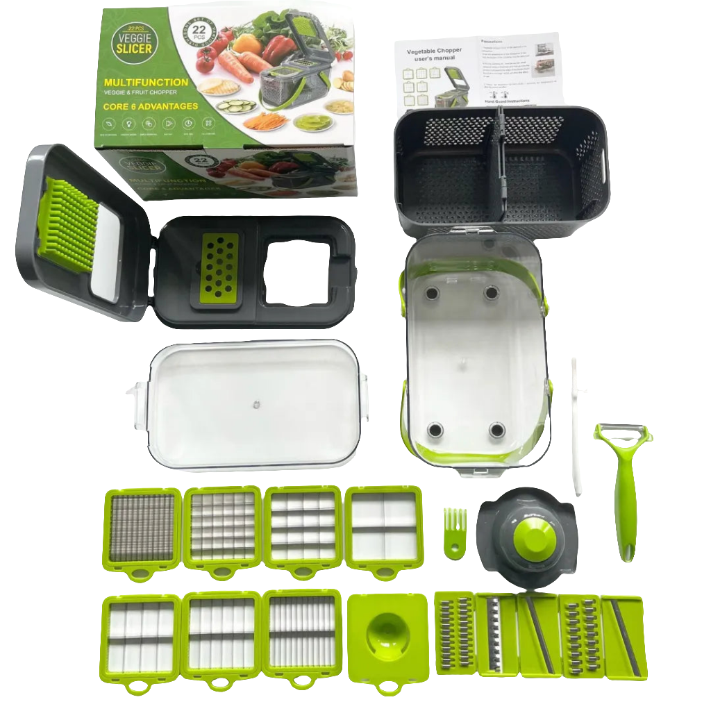 Transforma tu cocina con la Picadora de Verduras Multifuncional, la herramienta perfecta para rebanar, rallar, cortar en dados y decorar frutas y verduras en segundos. Con 13 cuchillas intercambiables y un diseño inteligente, esta picadora te ofrece versatilidad, seguridad y ahorro de tiempo en cada uso.