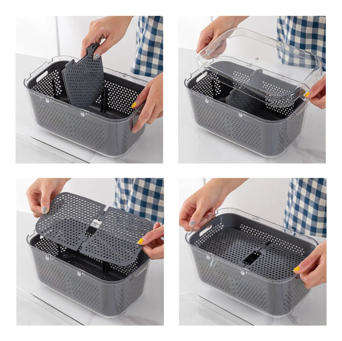 Recipiente de gran capacidad con cesta de filtro de agua para enjuagar y drenar fácilmente.
