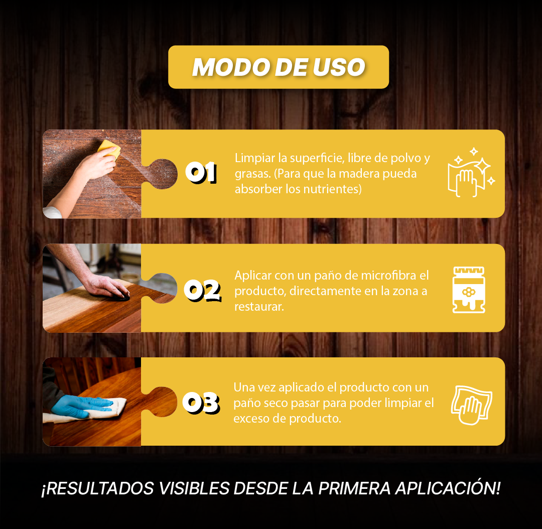 Solo aplica con un paño limpio siguiendo el sentido de la veta, deja actuar unos minutos y pule para lucir. Ideal para retoques rápidos o aplicaciones periódicas que mantengan madera vibrante y protegida.