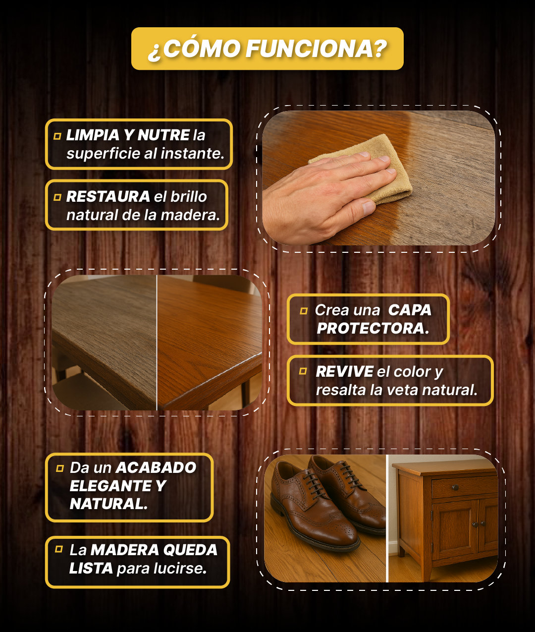 Disuelve suciedad acumulada y ceras viejas para restaurar el aspecto original del mobiliario, devolviendo el color y el lustre natural de la madera— ideal tanto para muebles antiguos como para pisos de madera, cueros y plásticos.